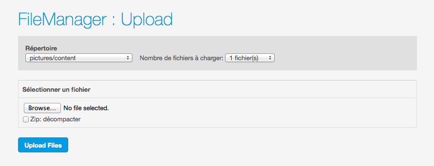 - Sélectionner votre fichier à envoyer en cliquant sur le bouton "Browse...". Cochez la case "Zip: décompacter" s'il s'agit d'un fichier compressé .zip.