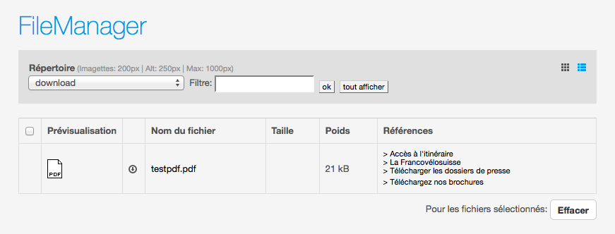 Sélectionnez un répertoire dans le menu déroulant "Répertoire" pour voir les fichiers qu'il contient, leur poids et les pages dans lesquelles ils sont utilisés. Les fichiers n'apparaissant sur aucune page peuvent être effacés.