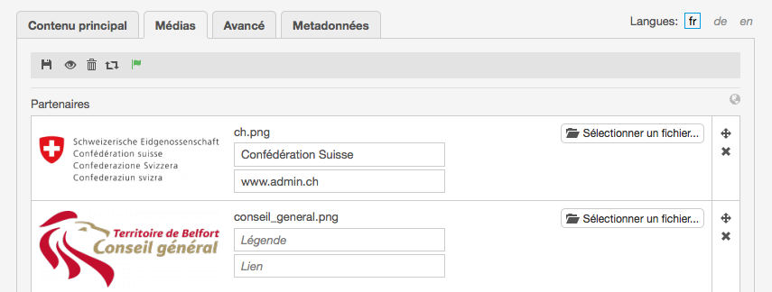Dans l'onglet "Médias" de cet article, vous pouvez ajouter les logos de différents partenaires, avec un lien vers un site externe le cas échéant.