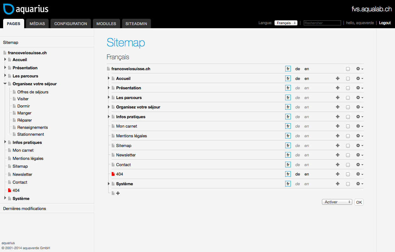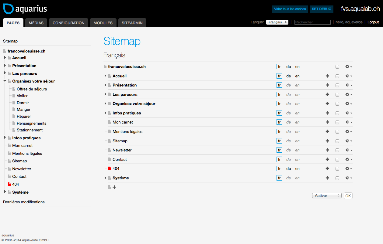 Une fois authentifié, vous aurez accès à l'interface d'administration du CMS aquarius (l'architecture sera détaillée dans les chapitres suivants) :